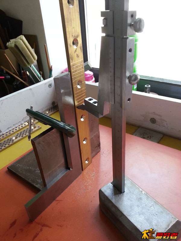 太高了,沒辦法畫垂直,可以在靠山上夾一把角尺,基板的直邊靠在角尺上劃線