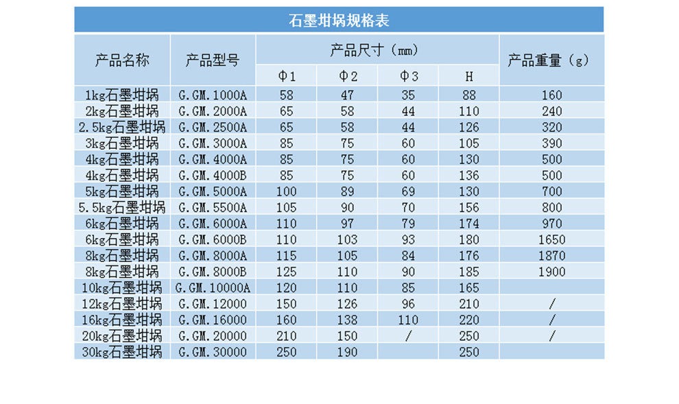 以上是一些石墨坩堝的規(guī)格,對應(yīng)型號的石墨坩堝價格可以來電咨詢,給到更實惠的價格。